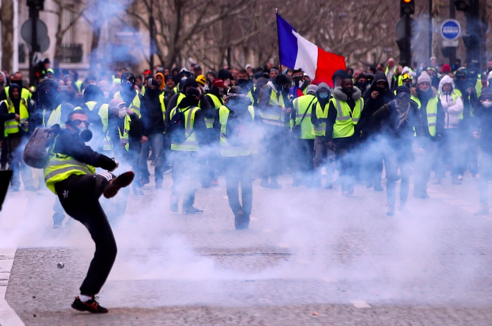Al mismo tiempo, en la avenida de los Campos Elíseos, algunos chalecos amarillos incendiaron cestos de residuos y contenedores, a lo que la policía respondió desplazando a los manifestantes y con algunos arrestos esporádicos.
