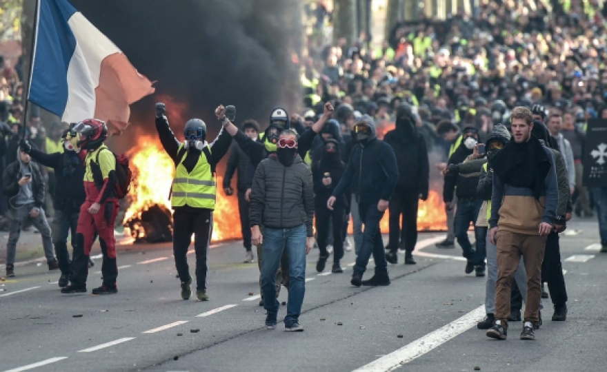 Al mismo tiempo, en la avenida de los Campos Elíseos, algunos chalecos amarillos incendiaron cestos de residuos y contenedores, a lo que la policía respondió desplazando a los manifestantes y con algunos arrestos esporádicos.