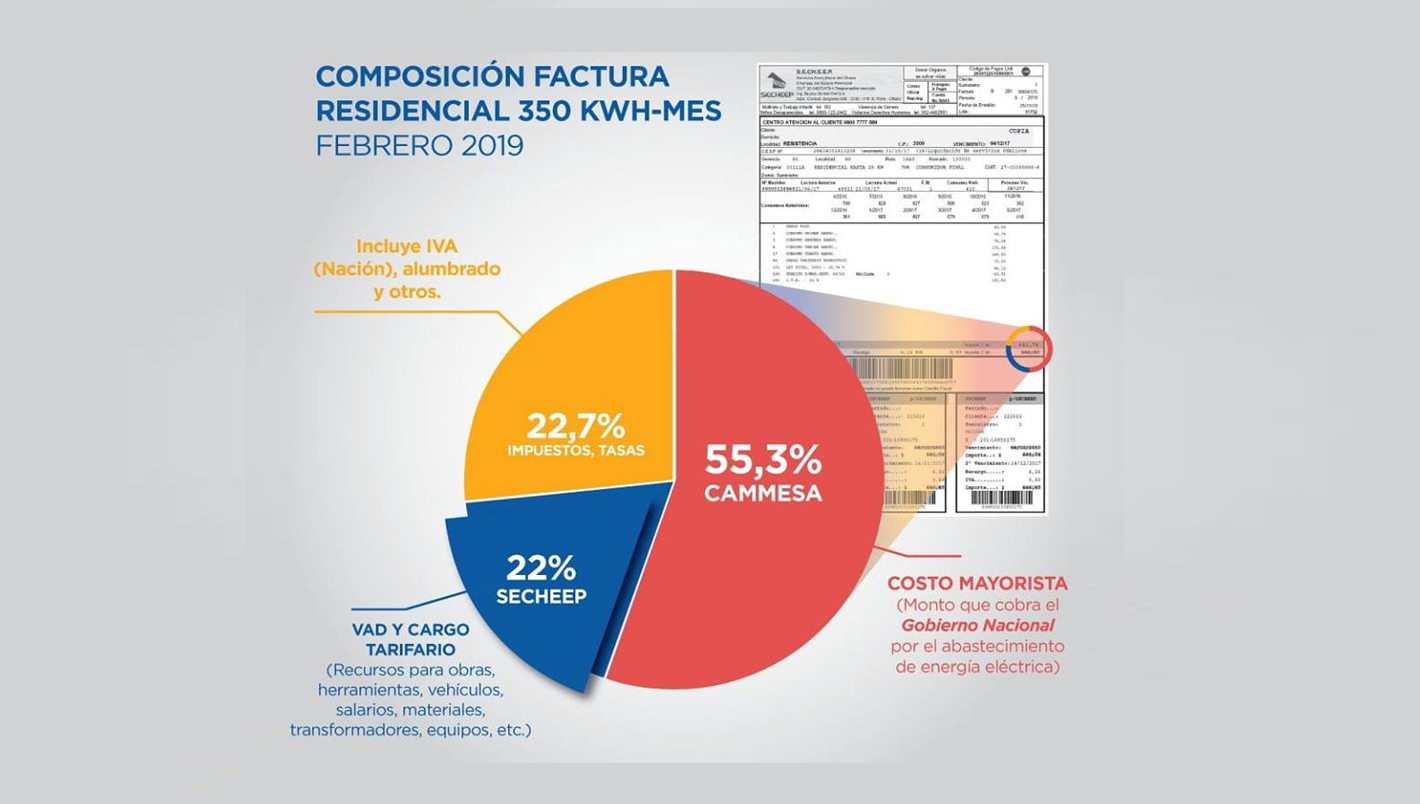 Detallaron que, a partir de la Resolución 366/2018 del Gobierno Nacional, del total del monto, el 55,3% es para el Costo de la Energía Mayorista (Cammesa); el 22,7% es para impuestos y tasas y el 22% para Secheep.