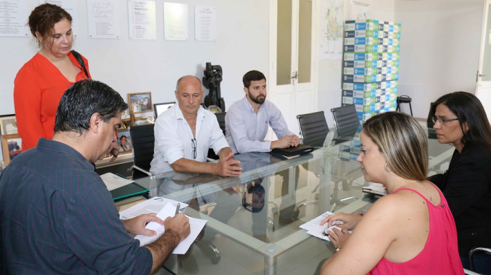 Participaron de la firma del convenio los directores ejecutivos de la Caja Municipal, Ricardo Pereyra y Laura Farela; y la subsecretaria de Hacienda y Presupuesto, Maia Woelflin.
