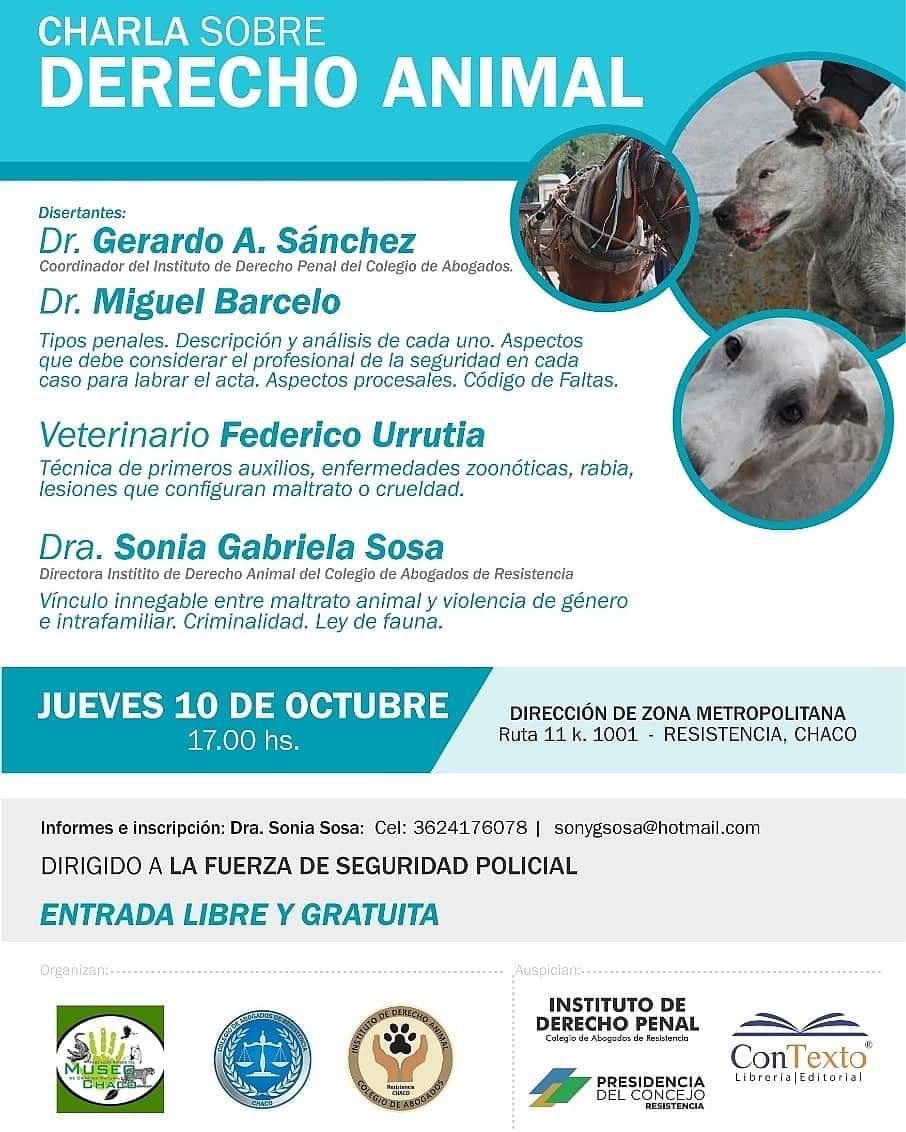 El próximo jueves se llevará adelante en la ciudad de Resistencia una charla sobre derecho animal dirigido a la fuerzas de la seguridad de la provincia.