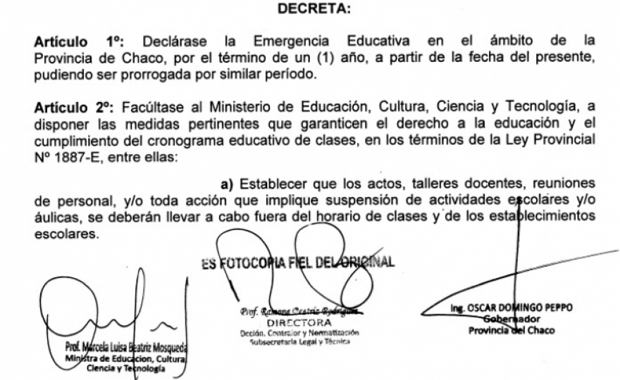 Desde el Poder Ejecutivo se dio a conocer en las últimas horas un decreto firmado por el gobernador, Domingo Peppo, que declara la Emergencia Educativa en el ámbito de la provincia por el término de un año.