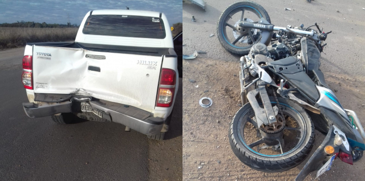 Una moto Yamaha TZ 150 negra impactó de lleno contra la parte trasera de una camioneta Toyota Hilux blanca esta mañana sobre la ruta nacional 16, cerca de Presidencia Roque Sáenz Peña.