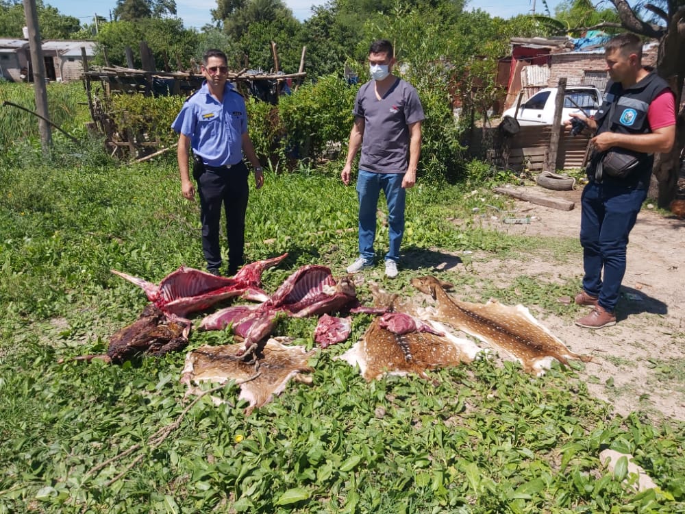 Una vez en el lugar, los policías hallaron restos de animales faenados en un asador. Debido a esto, continuaron siguiendo los rastros hacia una represa lindante donde encontraron dos reses enteras y tres cueros de ciervos.