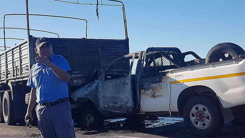 Una vez en el lugar, los efectivos constataron que uno de los partícipes del choque fue una camioneta Toyota Hilux, blanca, que viajaba desde Resistencia hacia Sáenz Peña y era conducida por un joven de 25 años, de Charata. Tras el choque, se prendió fuego.