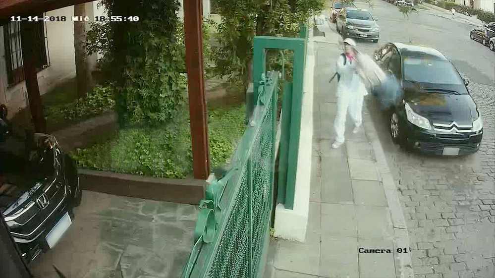 La secuencia dura 15 segundos. Viola tira la bolsa por arriba de la reja y corre. En las imágenes se puede percibir cómo, desde la vereda de enfrente de la casa del juez, uno de los agentes que la Policía de la Ciudad dispuso para custodiar a Bonadio corre para detener a Viola.