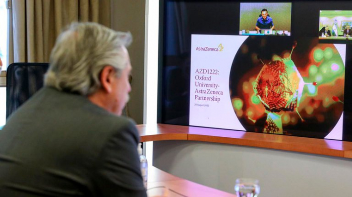 El presidente Alberto Fernández se comunicó esta jueves desde la Quinta de Olivos mediante videoconferencia con Pascal Soriot, CEO global del laboratorio AstraZeneca, que desarrollará en Argentina el principio activo de la vacuna contra el coronavirus COVID-19 para América Latina a partir del primer trimestre de 2021. En la comunicación, Soriot mostró una serie de diapositivas de un informe de la empresa sobre el desarrollo de la vacuna y adelantó que los resultados de los estudios clínicos estarán listos para noviembre de este año.
