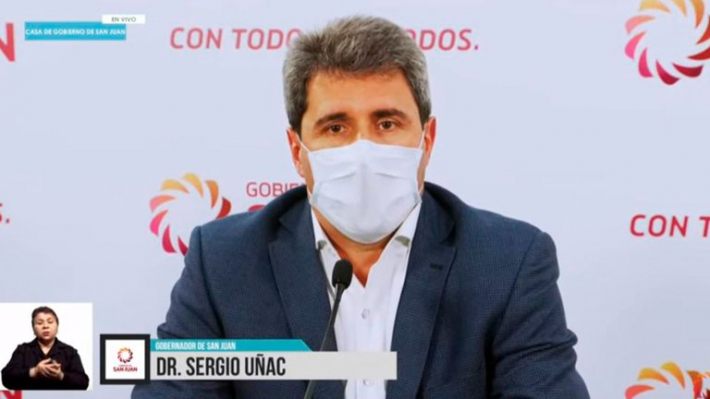 Con un barbijo que no se quitó en toda su alocución, el gobernador sanjuanino Sergio Uñac anunció que su provincia regresará a la fase 1 de la cuarentena. La terminante decisión se debió a un rebrote de casos de coronavirus en el departamento de Caucete. El total provincial se elevó a 50 contagiados. De estos, 4 están en estado crítico, uno con respirador mecánico. Además, se hicieron 1.000 hisopados y 81 personas están aisladas.