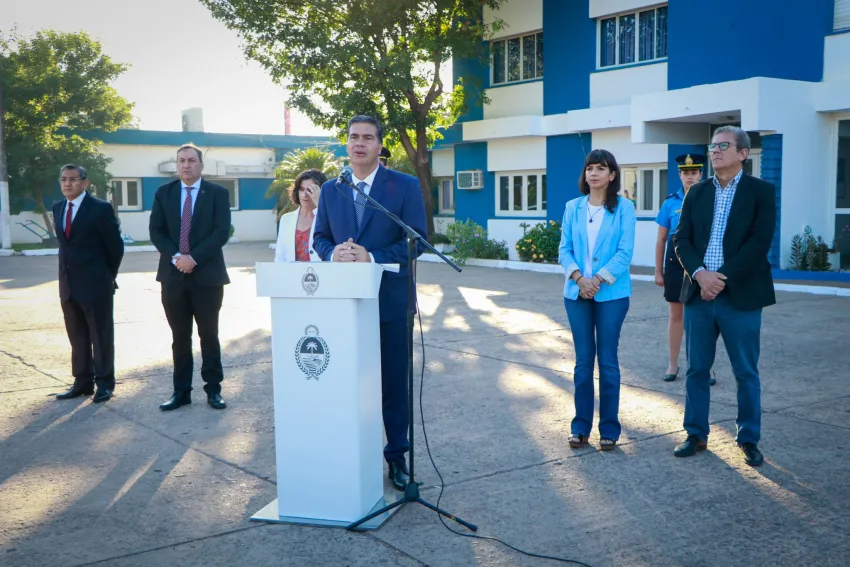 El anuncio lo hizo desde la plaza de Armas de la Policía del Chaco, acompañado de la vicegobernadora Analía Rach Quiroga; de la ministra de Seguridad y Justicia, Gloria Zalazar; del ministro de Educación, Aldo Lineras; del director nacional de Ingresos y Carreras del Ministerio de Seguridad de la Nación, Ariel Legnani y del Jefe de la Policía, Ariel Acuña.