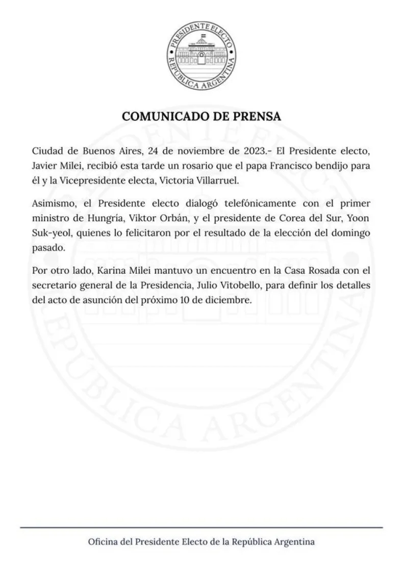 Según explicó la oficina de prensa de Milei, Francisco detalló que el rosario fue bendecido tanto para Milei como para la vicepresidenta electa, Victoria Villarruel.