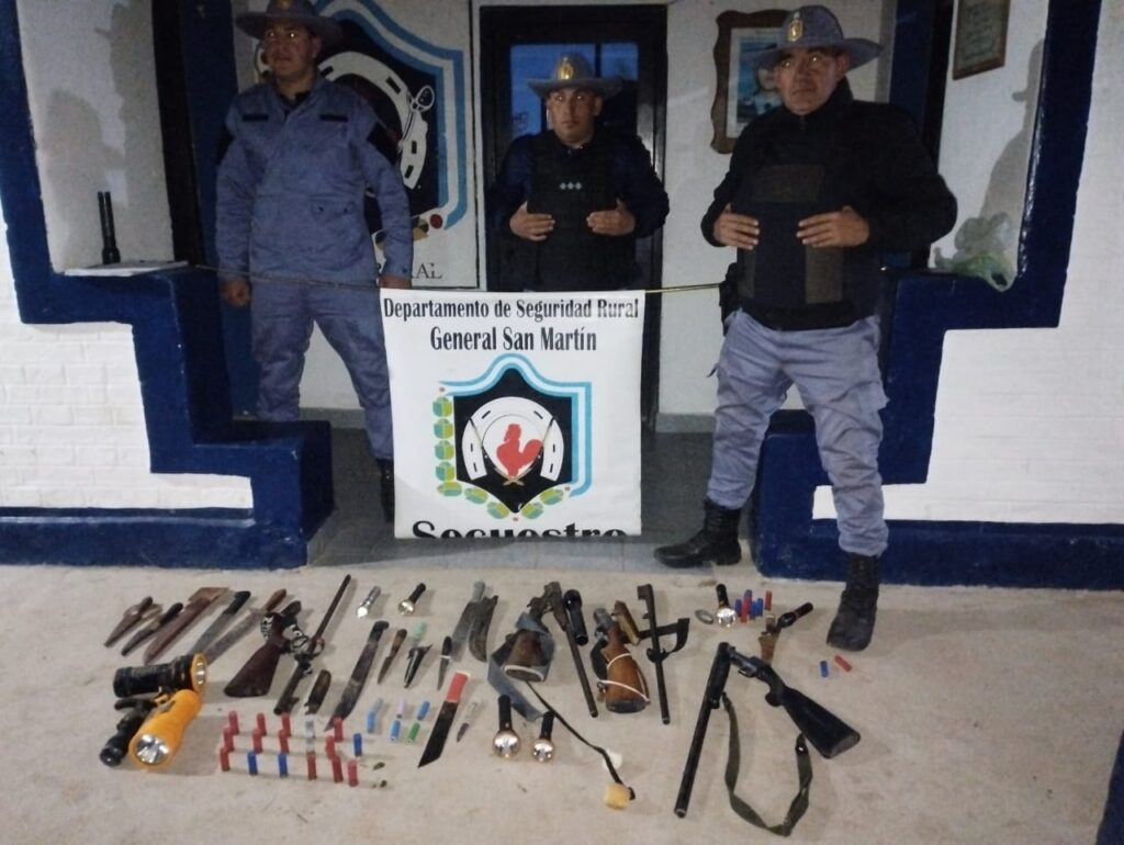 Efectivos del Departamento de Seguridad Rural de General San Martín concretaron dos operativos en zonas rurales de Colonia Elisa y Colonias Unidas, donde interceptaron a cazadores furtivos y secuestraron armas de fuego, cuchillos, linternas y animales silvestres en infracción a la Ley Provincial N°1429 de Caza.